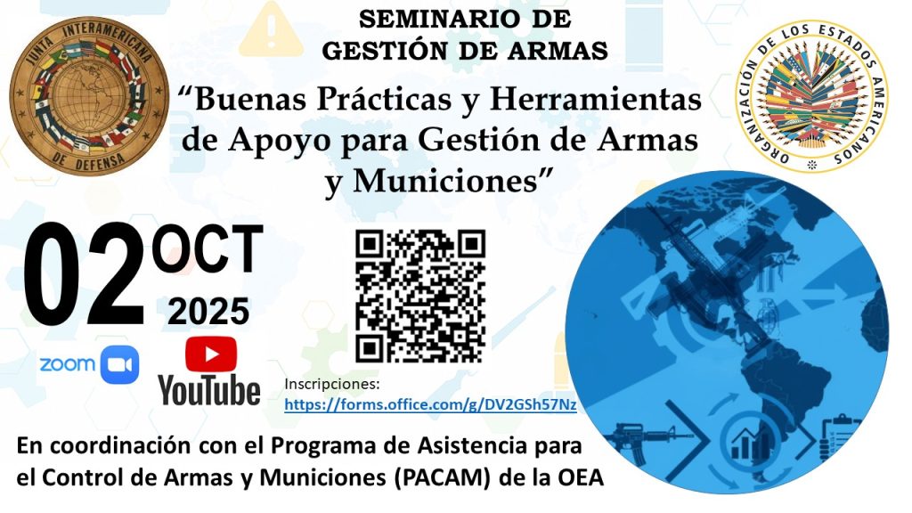 On Thursday, October 2, 2025, from 9:00 a.m. to 1:00 p.m. (Washington, DC, USA time), the Seminar "Good Practices and Support Tools for Weapons and Ammunition Management" will be held. It has been organized by the Inter-American Defense Board in coordination with the Inter-American Defense Assistance Program (IADP).