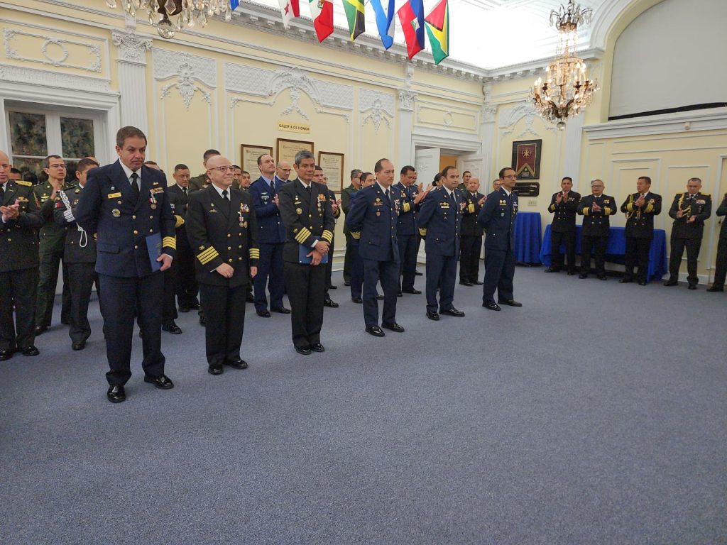 On October 29, 2025, in the Hall of Flags at the Soldiers' House, the Inter-American Defense Board (IADB) Medal Conferral Ceremony was held for officers and technicians completing their service in November and returning to their home countries. Family members and all military personnel participated in the event, which was presided over by the IADB leadership. The recipients were Commander Ricardo Barillo, Coordinator of the Inter-American Organizations Section of the Brazilian Ministry of Defense; Colonel Juan Alarcón, Vice-Secretary of Service; Captain Jorge Saldana, Vice-Secretary of Service; and Technician Rubén Romero, Human Resources Advisor.