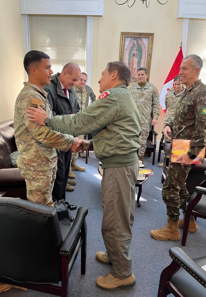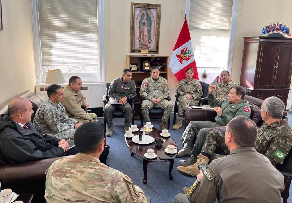 The distinguished visitors were received by the President of the Council of Delegates of the Inter-American Defense Board (IADB), Major General FAP César Macedo, and by the Director General of the IADB Secretariat, Division General Reinaldo Salgado Beato.